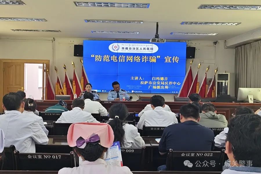 为切实保障人民群众利益,严厉打击电信诈骗犯罪,加强群众自我保护意识,提高防骗识骗能力,结合工作实际。2024年7月24日广场派出所龙王潭警务室联合拉萨市局反诈中心民警对辖区自治区人民医院职工开展防范网络电信诈骗宣传讲座。