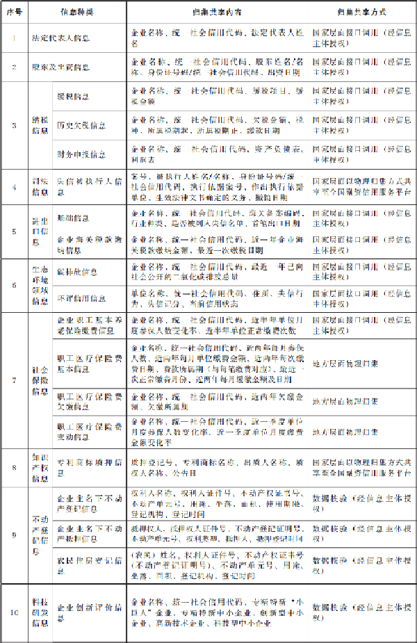 (四)明确信用信息归集共享范围。根据金融机构对信用信息的实际需求,进一步扩大信用信息归集共享范围,将企业主要人员信息、各类资质信息、进出口信息等纳入信用信息归集共享清单(见附件),国家发展改革委牵头适时对清单进行更新。各地区要充分发挥地方融资信用服务平台作用,进一步破除数据壁垒,依法依规加大清单外信用信息归集共享力度,结合本地区实际编制省级信用信息归集共享清单,有效拓展数据归集共享的广度与深度。