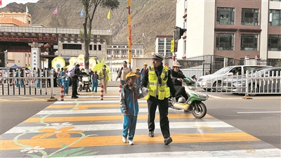 图为交警护送学生过马路。拉萨融媒记者格桑卓嘎摄